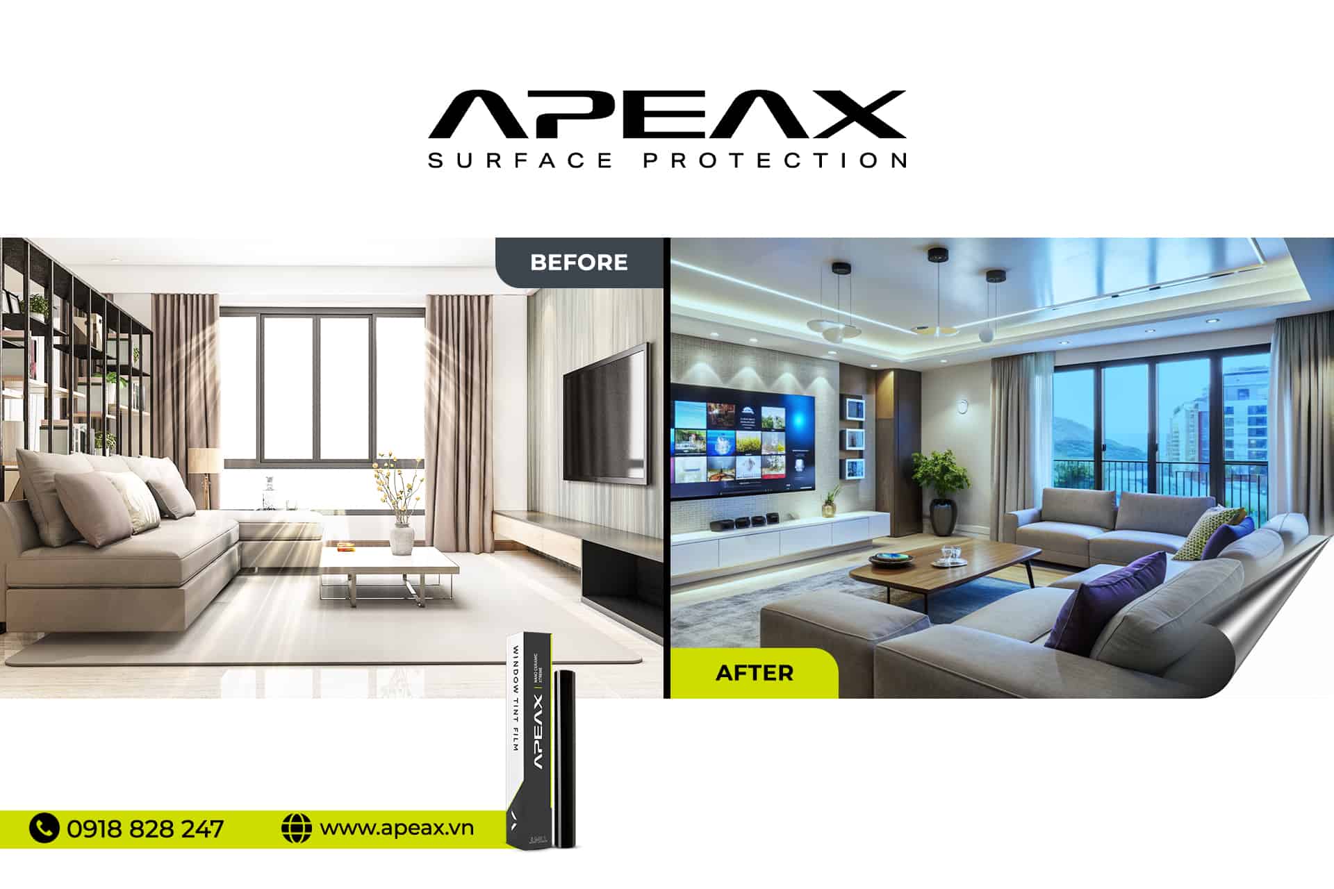 Ánh nắng xuyên kính là tác nhân gây bạc màu, cong vênh và lão hóa nội thất. Phim APEAX giúp duy trì độ mới cho rèm, sofa, sàn gỗ và thiết bị điện tử.