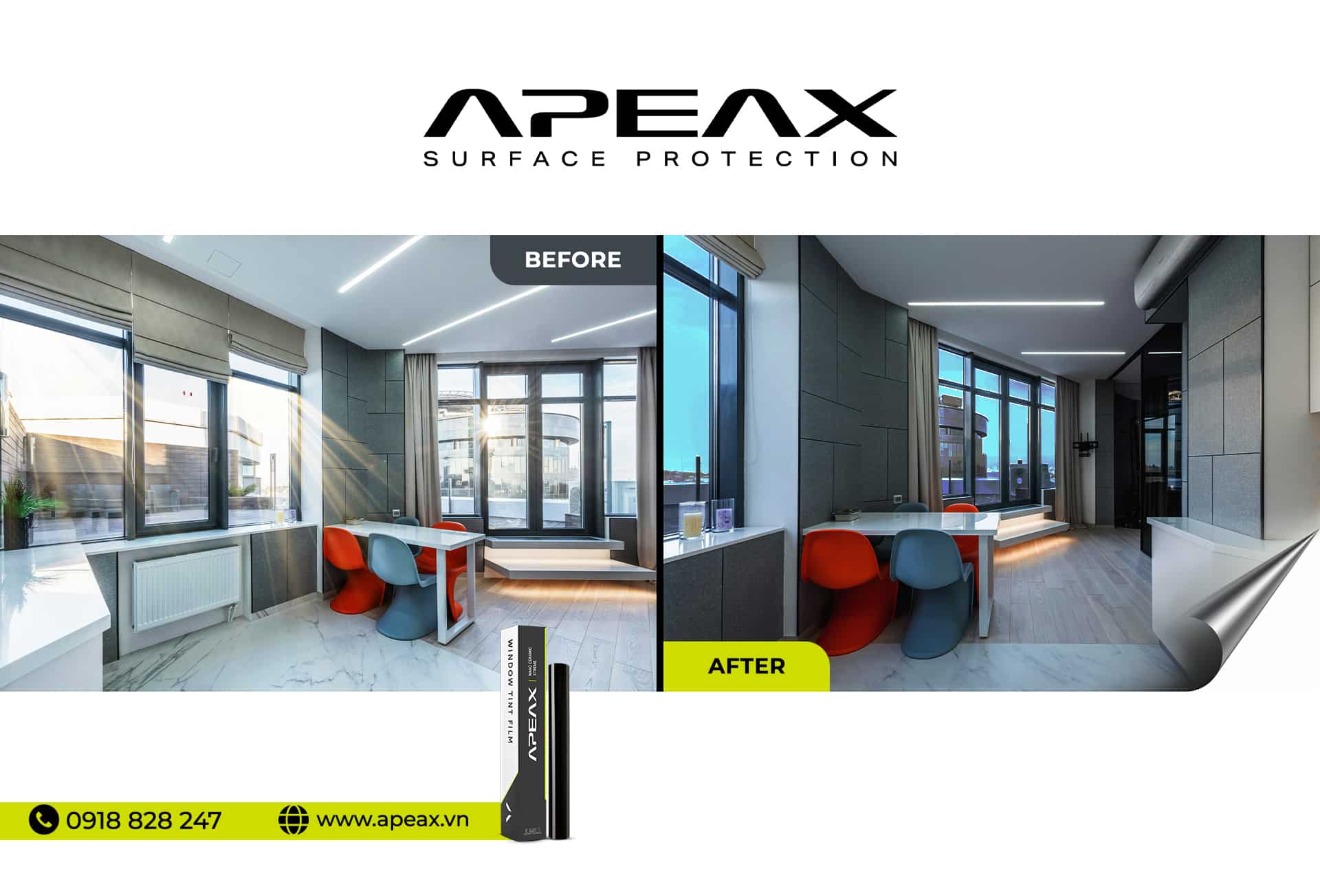 APEAX khuyến nghị quý khách hàng nên chọn loại phim cách nhiệt có màu đen (VLT<50%) hoặc màu xám khói trung tính hoặc có độ phản gương nhẹ để vừa hiệu quả cách nhiệt vừa không gây tối phòng và có thể giảm chói lóa.